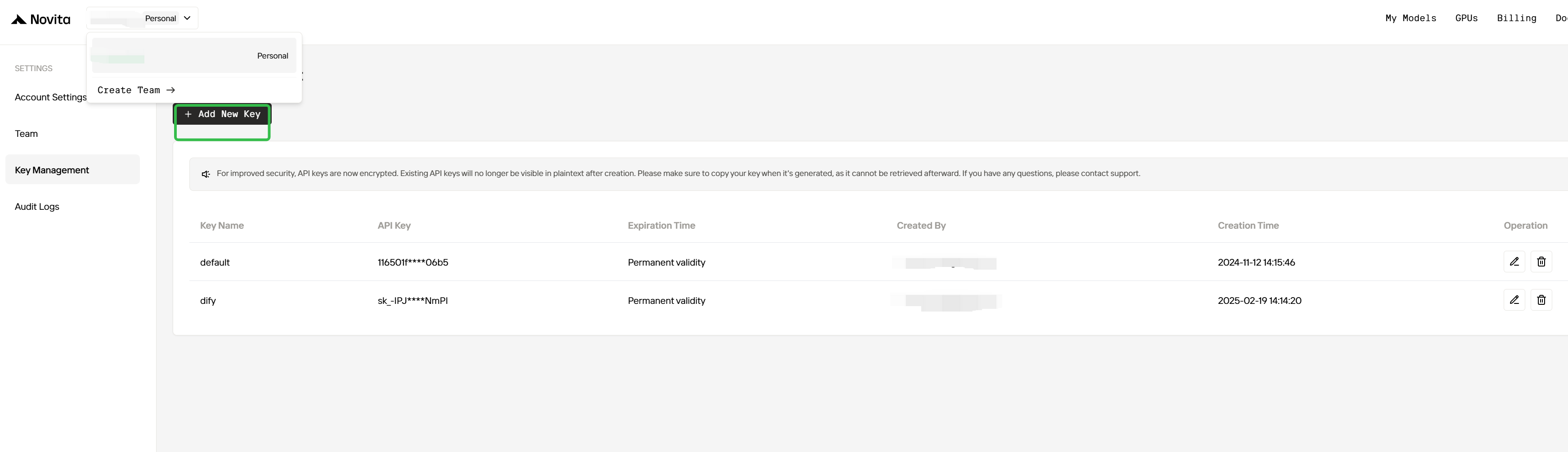 * Enter your [Novita API Key](https://novita.ai/settings/key-management) in the **API Key** field.